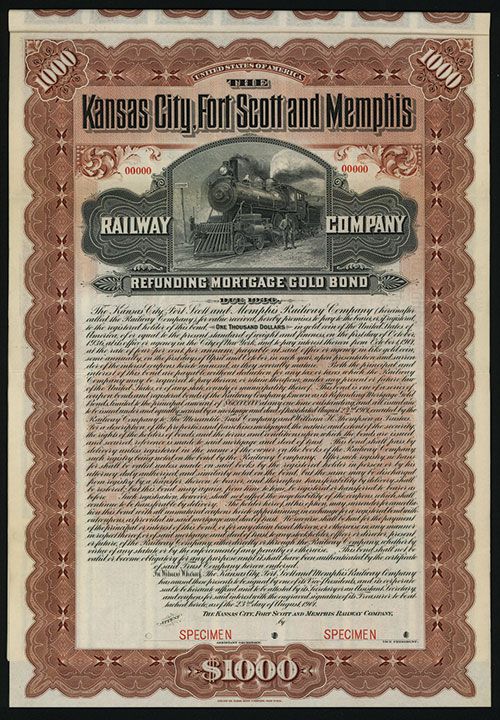 Kansas. 1901. $1000, 4% Refunding Mortgage Gold Bond. Rust border and underprint, Street car city scene on top with allegorical cherub on bottom. Specimen, POC's, Coupons attached. VF- XF. Scarce and attractive Kansas railroad bond only known as specimen.
