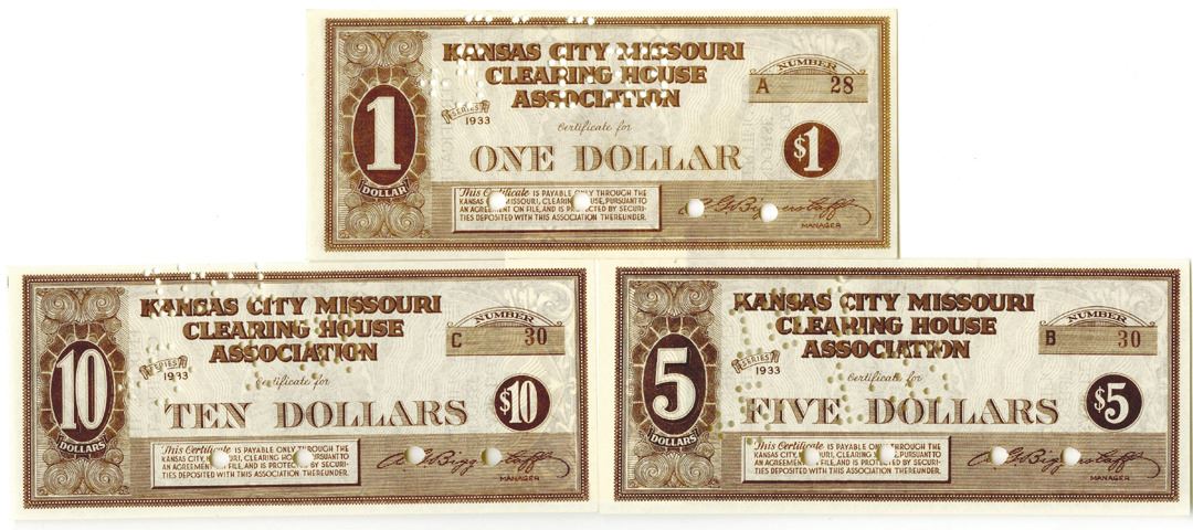 Kansas City, MO. Lot of 3 Depression Scrip Notes, Includes $1, 5, and 10 Dollars Depression-era scrip notes, all POC and perforation-canceled. About Uncirculated to CU Condition. (3)