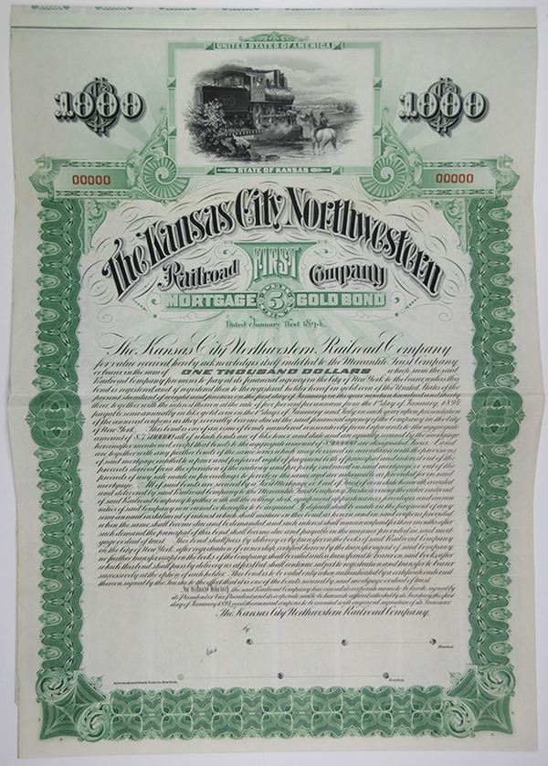 Kansas. $1000 Specimen 5% 1st Mortgage Gold Coupon Bond, Black print on a large green border and under tint, framed image of locomotive passing river with a horse and rider watching, Specimen overprints, POC's, VF-XF condition. IBNC. This is the only example found in the archives, rare and attractive.