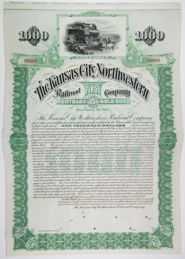 Kansas & Missouri. $1000 Specimen 5% 1st Mortgage Gold Coupon Bond, Black print on a large green border and under tint, framed image of locomotive passing river with a horse and rider watching, Specimen overprints, POC's, VF-XF condition. IBNC. This is the only example found in the archives, rare and attractive.