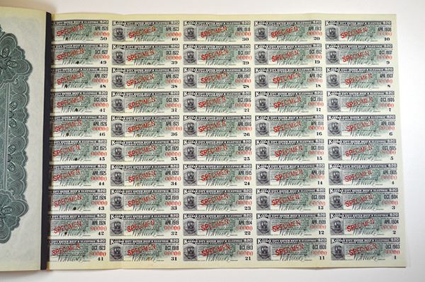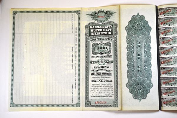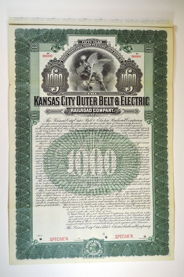 Kansas, Specimen $1000 1st Mortgage, 4% Gold Coupon Bond, Black on green border and underprint, Allegorical angel holding electric light over title, VF-XF, POC's, ABNC. Listed railroad in Cox, only known as a specimen, rare.