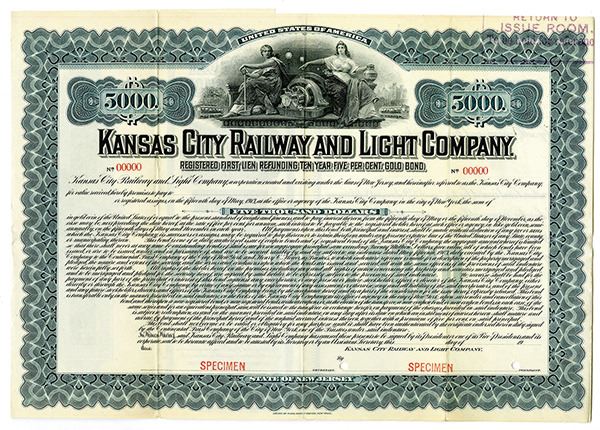Missouri (Inc. in New Jersey), 1903. $5000 Specimen 5% Registered First Lien Refunding Gold Bond, Black text with blue border and underprint, Two allegorical figures flank large gear at top center. Red specimen overprints, 00000 serial numbers, Return to issue room stamp at top right, POCs. Fine condition, ABNC. Only know as a specimen in Cox.