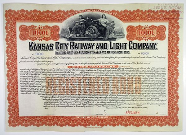Incorporated in New Jersey, 1903 Specimen Bond. $1000 Registered First Lien Refunding 5% Gold Bond, Black text with orange border and undertint, Two female figures seated alongside machine. Red specimen overprints, POC's and "00000" serial numbers, XF condition with Return to Issue Room stamp on top right, ABNC NY.