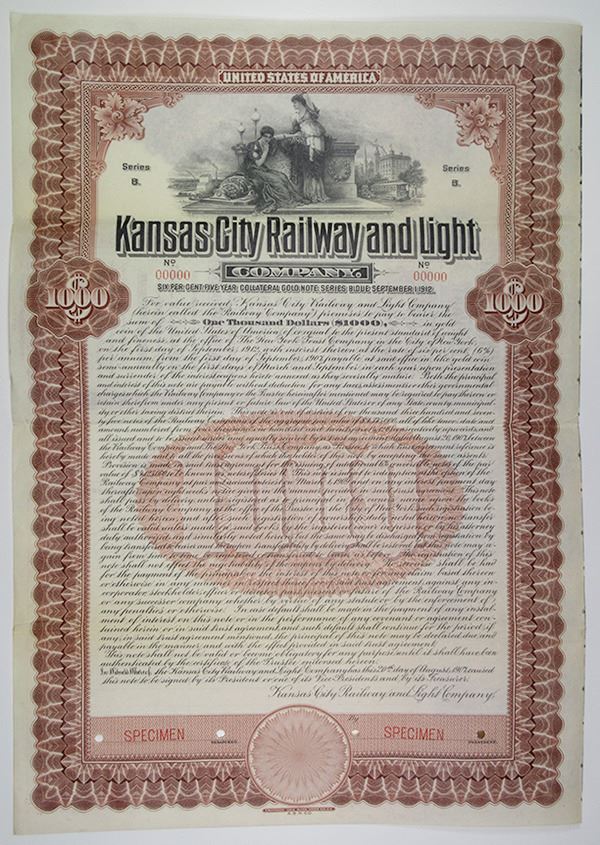Incorporated in New Jersey, 1907 Specimen Bond. $1000 Series B Collateral 6% Gold Coupon Bond, Black text with red-brown border and undertint, Allegorical figures near generator. Red specimen overprints, POC's and "00000" serial numbers, VF condition.
