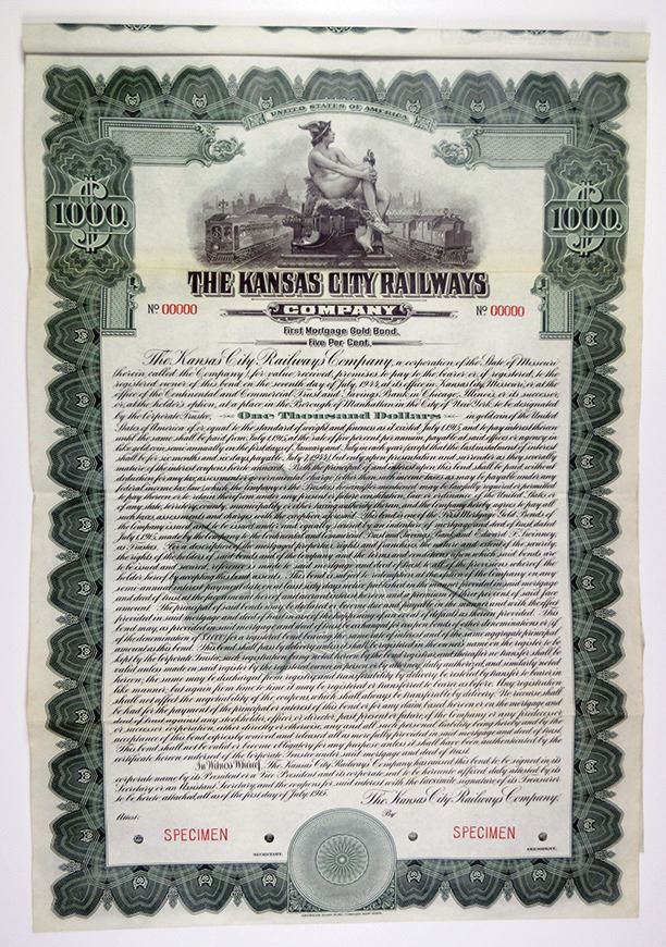Missouri, 1915 Specimen Bond. $1000 First Mortgage 5% Gold Coupon Bond, Black text on green border and undertint, Allegorical Hermes seated atop a transistor in front of railyard. Red specimen overprints, POC's and "00000" serial numbers, XF condition, ABNC NY. Only known as a Specimen in Cox. Rare