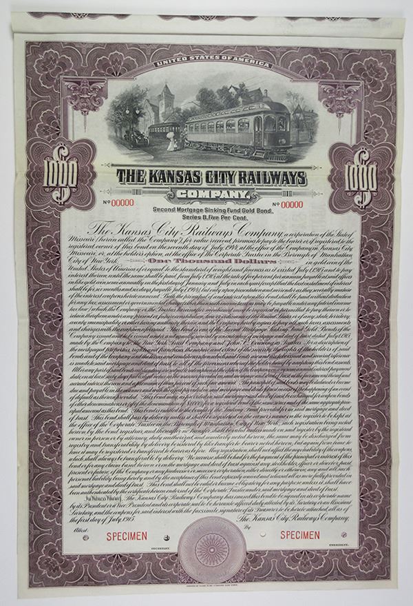 Missouri, 1915 Specimen Bond. $1000 Series B Second Mortgage 5% Sinking Fund Gold Coupon Bond, Black text with purple border and undertint, Electric trolly scene at top with loading passengers. Red specimen overprints, POC's and "00000" serial numbers, XF condition, ABNC NY.