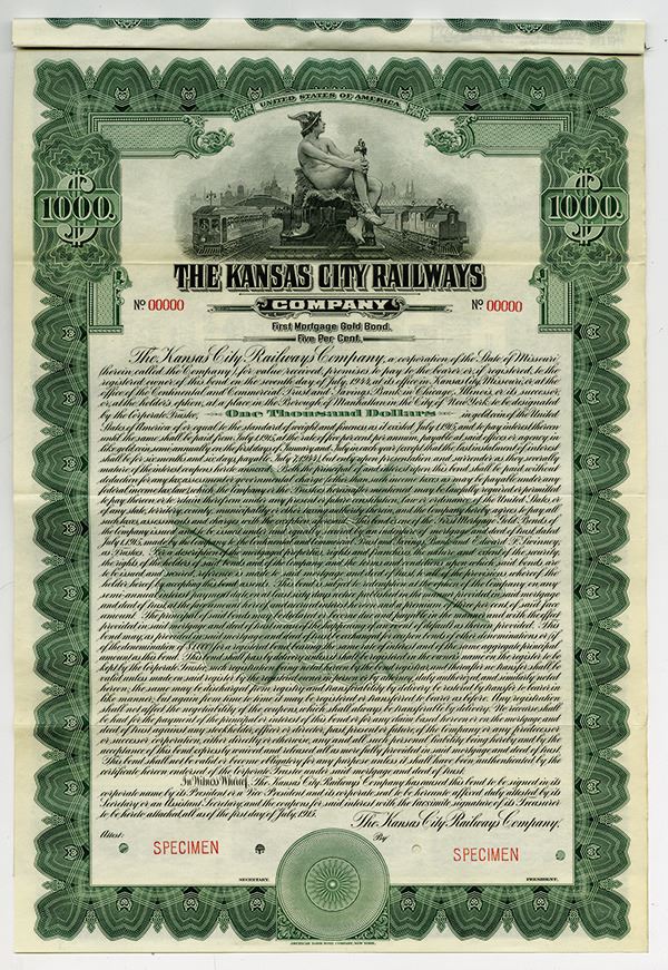 Missouri. $1,000 Specimen 5% First Mortgage Gold Coupon Bond, Black print on green border and under tint, Figure of Hermes sitting on generator between two locomotives at top, Specimen overprints and POC's, VF-XF condition, ABNC. Only known as a specimen bond in Cox, no issued examples known.