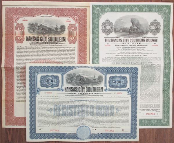 Kansas City, Missouri. Lot of 3 Specimen bonds, Includes: 1909, $1000 Specimen 5% Refunding and Improvement Mortgage Gold Coupon Bond in brown; 1940, $1000 Specimen 2.5% Equipment Trust Bond in green, Unlisted in Cox; and 1909, $5000 Specimen 5% Registered Refunding and Improvement Mortgage Gold Bond in blue. All have specimen overprints, 00000 serial numbers, POCs, and are in Fine-VF condition. ABNC. Blue bond is rare, green bond is unlisted type in Cox. All are rare as specimens. (3)