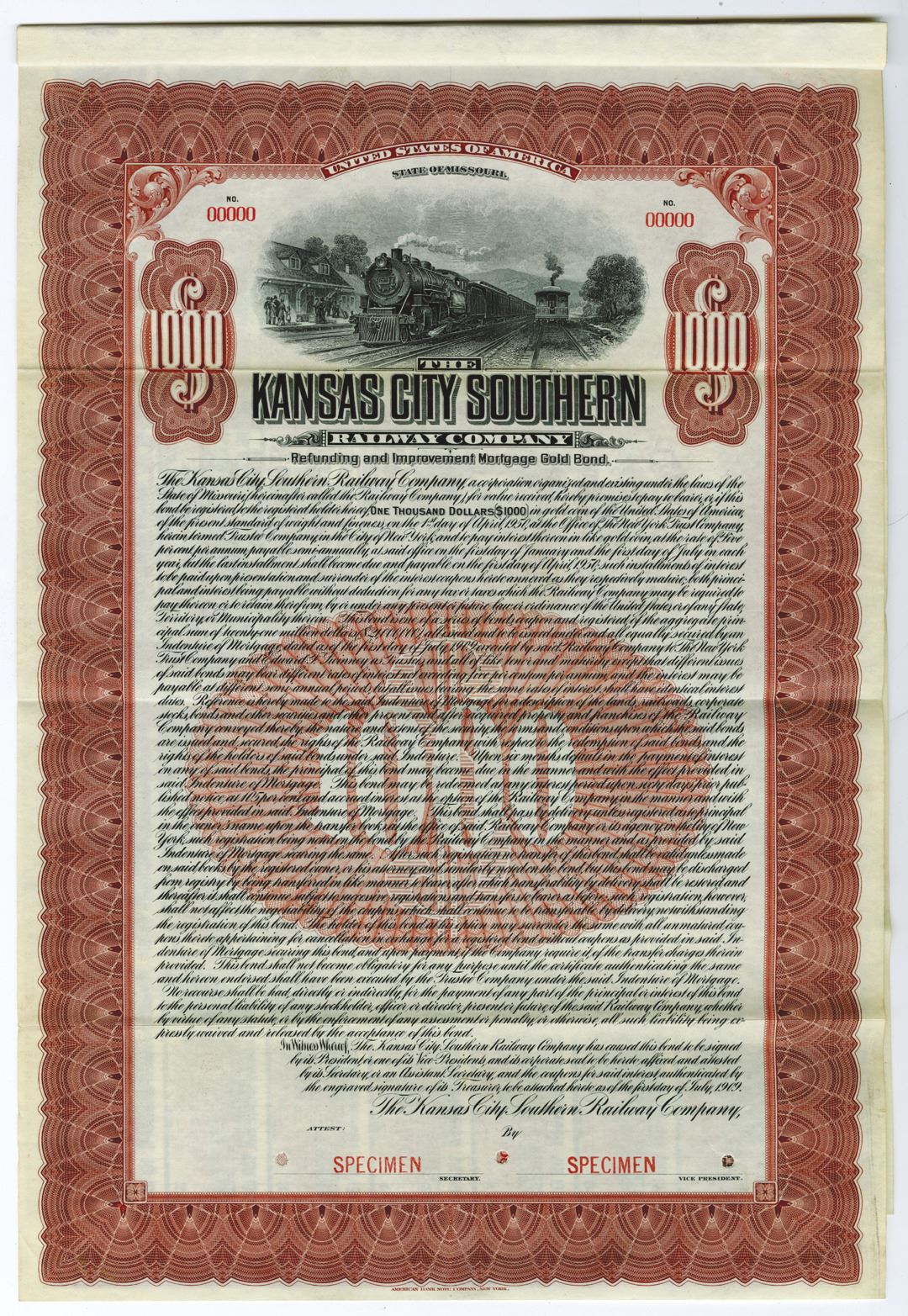 Missouri. $1,000 Specimen 5% Refunding and Improvement Mortgage Gold Coupon Bond, Black print on brown border and under tint, Locomotive approaching station with one leaving at top, Specimen overprints and POC's, VF-XF condition, ABNC. Only known as a specimen in Cox, no issued examples known.