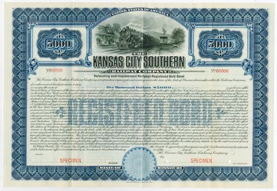 MO. KS. (Inc. in New Jersey). 1909, $5,000 Registered 5% Specimen Refunding and Improvement Mortgage Gold Bond, Black print on blue border and under tint on horizontal format, 20th century train at station with another train departing besides it, Specimen overprints and POC's, VF-XF condition, ABNC. Listed railroad on Cox, unlisted denomination.