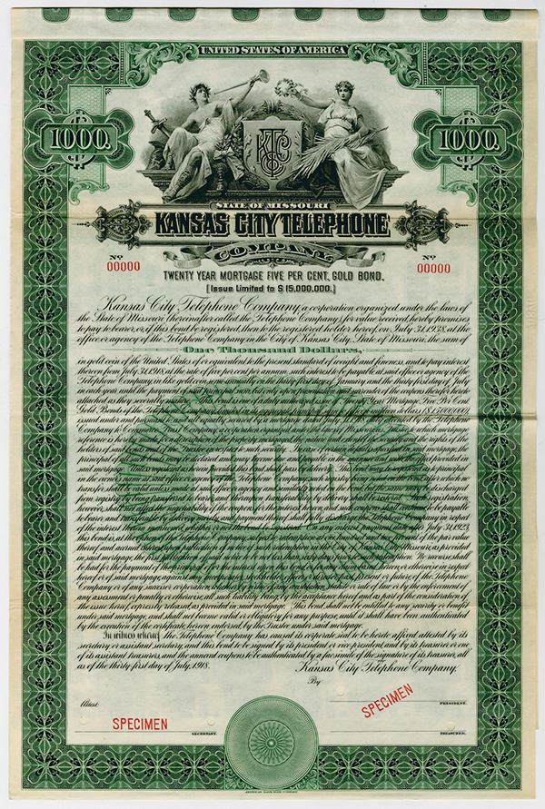 Missouri. $1,000 Specimen 5% Twenty Year Mortgage Gold Coupon Bond, Black print on green border and under tint, Allegorical figures at top flanking company initials, Specimen overprints and POC's, VF-XF condition, ABNC.