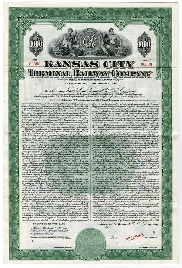 Missouri. $1,000 Specimen 2 3/4% First Mortgage Serial Coupon Bond, black print on green border and under tint, Two allegorical men at top above company title, flanking circular company logo, Specimen overprint and POC's, VF- XF condition. Listed bond in Cox, unlisted color variety.