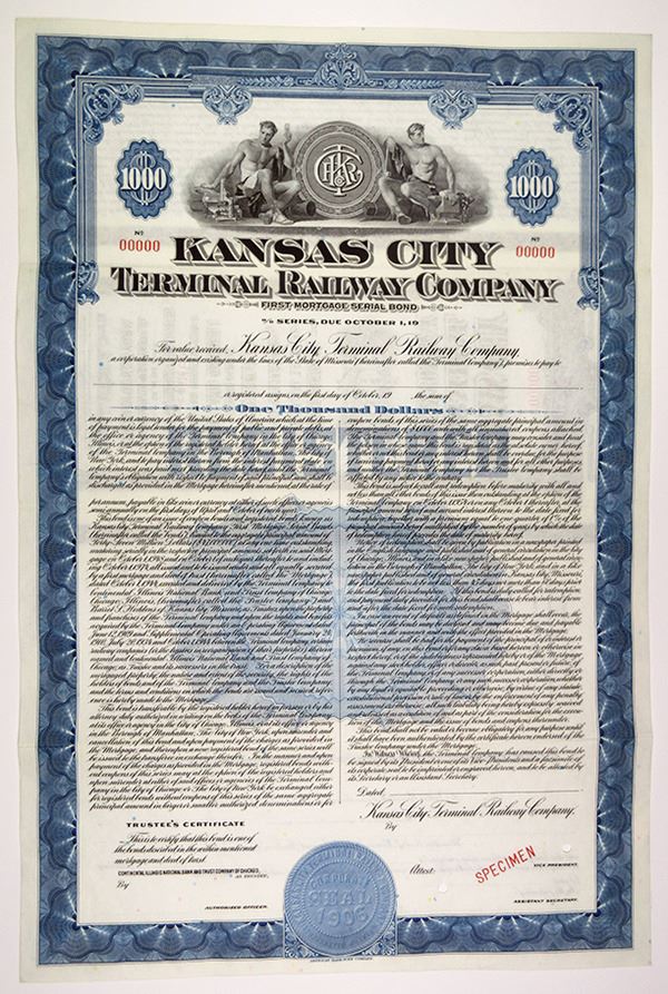 Missouri, ND (ca. 1920-1940s). $1000 First Mortgage Serial Bond, Black text with blue border and undertint, Allegorical figures of two men seated by company logo. Red specimen overprints, POC's and "00000" serial numbers, XF condition.