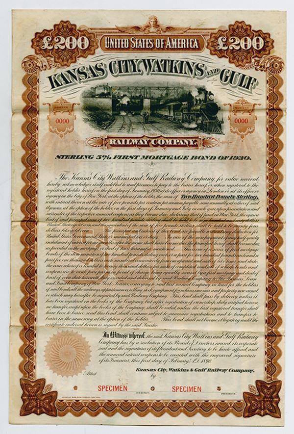 Kansas. Louisiana. New York. 1890 Specimen Bond. £200 First Mortgage 5% Sterling Bond, Black text with brown border and undertint, allegorical scene of two trains arriving at railyard. Red specimen overprints, POC's and "0000" serial numbers. VF condition, ABNC NY. Unlisted variety, denomination and color in Cox. Unique example found in Cox, no other examples found.