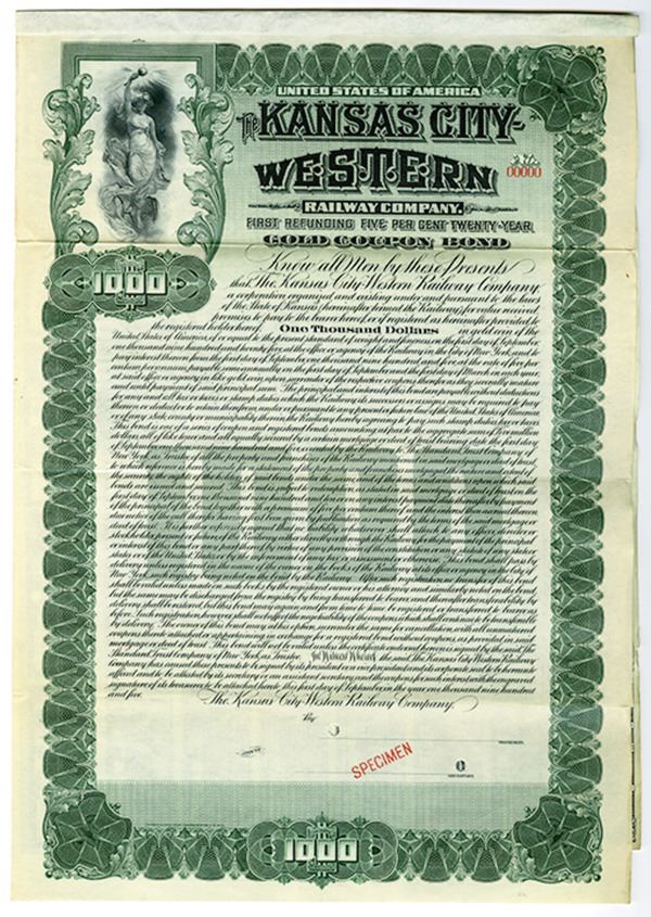 Kansas, 1905 Specimen $1000 First Refunding 5% 20 Year Gold Coupon Bond, black printing with green border and undertint, allegorical woman holding light while standing on rail wheel. Red Specimen overprint, POC's and "00000" serial numbers. Fine-VF condition with minor fraying and toning along right edge. International BNC. Only known as a specimen in cox and extremely rare.