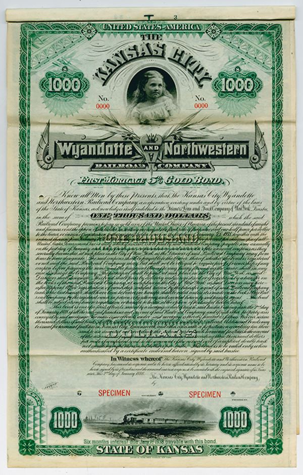 Kansas, 1888 Specimen Bond. $1000 First Mortgage 5% Gold Coupon Bond, Black text with green border and undertint, allegorical figure of a young girl at top, locomotive at bottom. Red specimen overprints, POC's and "0000" serial numbers. VF-XF condition with very slight tear along middle horizontal fold, ABNC NY. Only one issued example has been seen previously, no specimens previously known. This example was unique in the ABN Archives.
