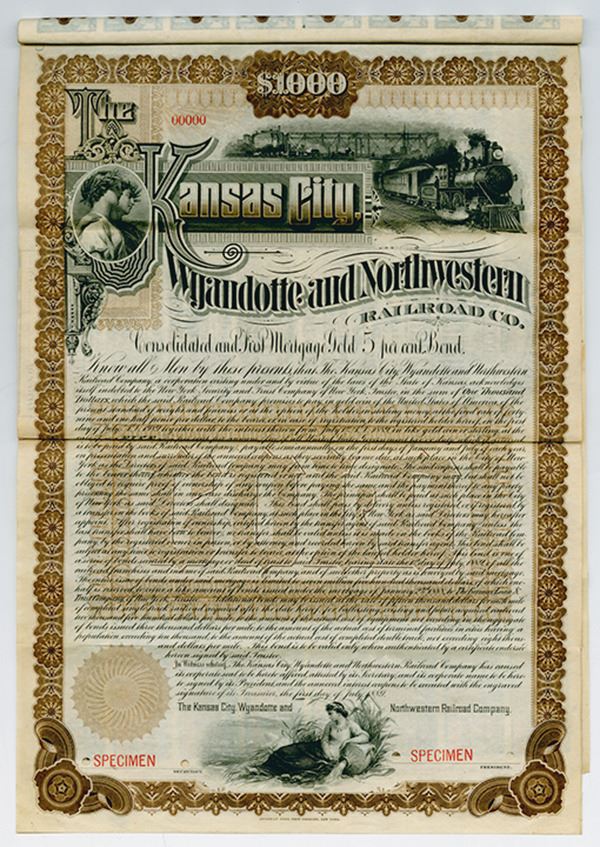 Kansas, 1889 Specimen Bond. $1000 Consolidated and First Mortgage 5% Gold Coupon Bond, Black text and vignette on brown border and undertint, Two allegorical "Reaper" figures at left, ornate title to right with locomotive on tracks, bottom with allegorical woman pouring water from jug. Red specimen overprints, POC's and "00000" serial numbers. VF-XF condition, ABNC NY. Only one Progress proof of the text and vignette are known, no issued or specimen examples have been seen previously. This unique specimen example was found in 2002 in the ABN Archives.