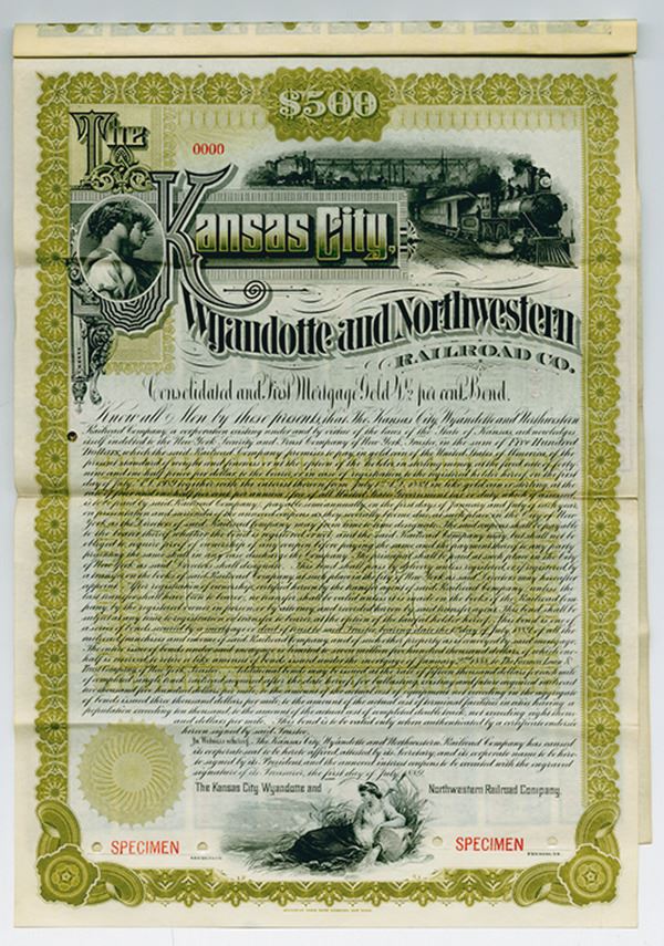 Kansas, 1889 Specimen Bond. $500 Consolidated and First Mortgage 4 1/2% Gold Coupon Bond, Black text on OLIVE border and undertint, Two allegorical figures at left, locomotive on tracks to the right. Red specimen overprints, POC's and "0000" serial numbers. XF condition, ABNC NY. Cox list this as a specimen but is not pictured. This unique specimen example was found in 2002 in the ABN Archives.