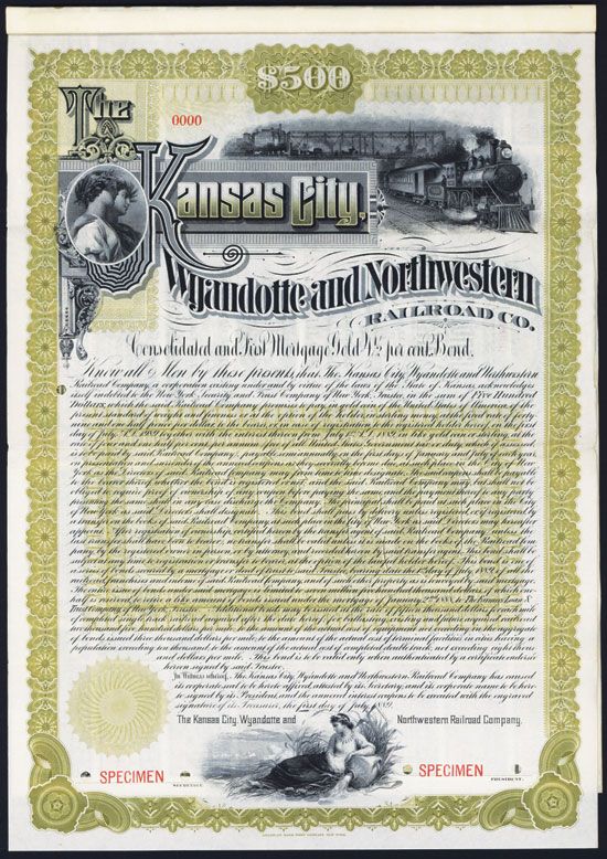 Kansas, 1889, $500, 4 1/2% Consolidated and 1st Mortgage Gold Specimen Bond, Black on green border and underprint, Vignette top right of locomotive moving under bridge with vignette bottom center of reclined allegorical woman on hilltop with spilling jug of water, Red SPECIMEN overprints POC's and S/N Ò0000Ó, VF-XF condition, ABNC. Railroad listed in Cox but unlisted bond. Lovely and very rare bond.