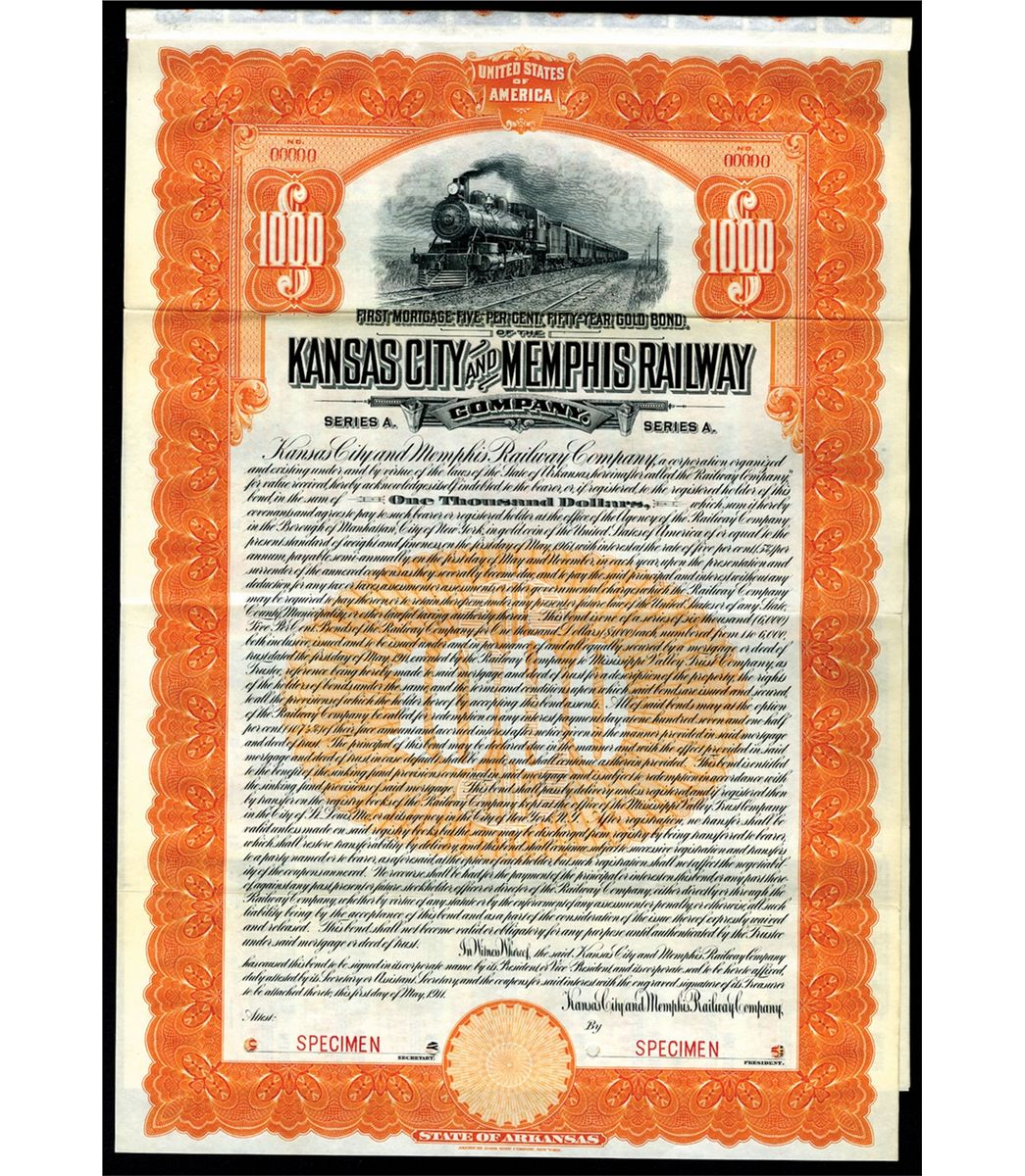 Arkansas. 1911. $1,000 First Mortgage 5%, Series A, Gold Coupon Bond Specimen, Orange border and undertint, Locomotive 969 passing telegraph poles R-L. POC's. XF, ABNC. Unlisted railroad in Cox. Attractive and rare.