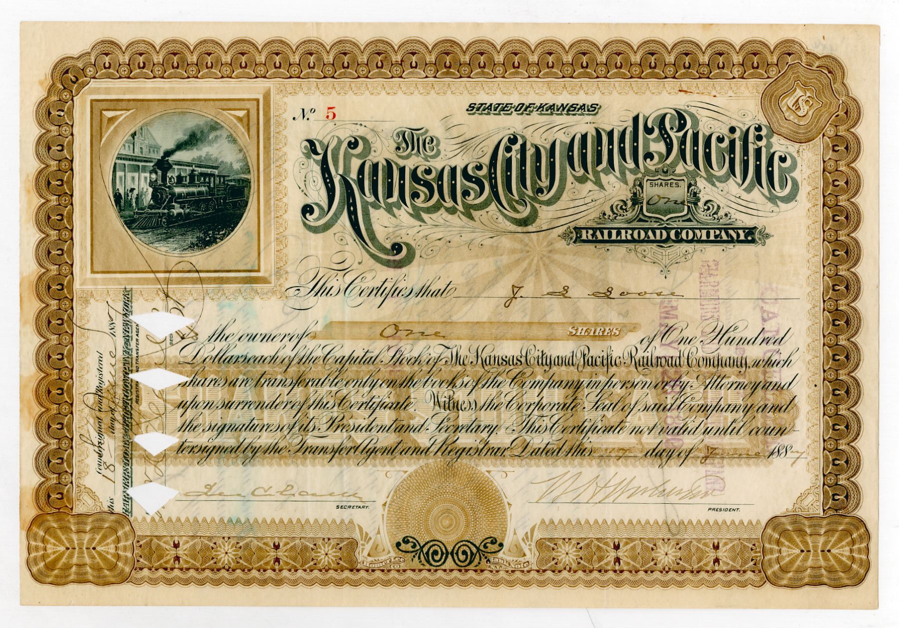 Kansas, 1887, 1 Share, I/C stock certificate, Black on brown and light brown, Locomotive at station top left corner, Low S/N 5, POC's, VF condition, Homer Lee BNC. Scarce railroad.