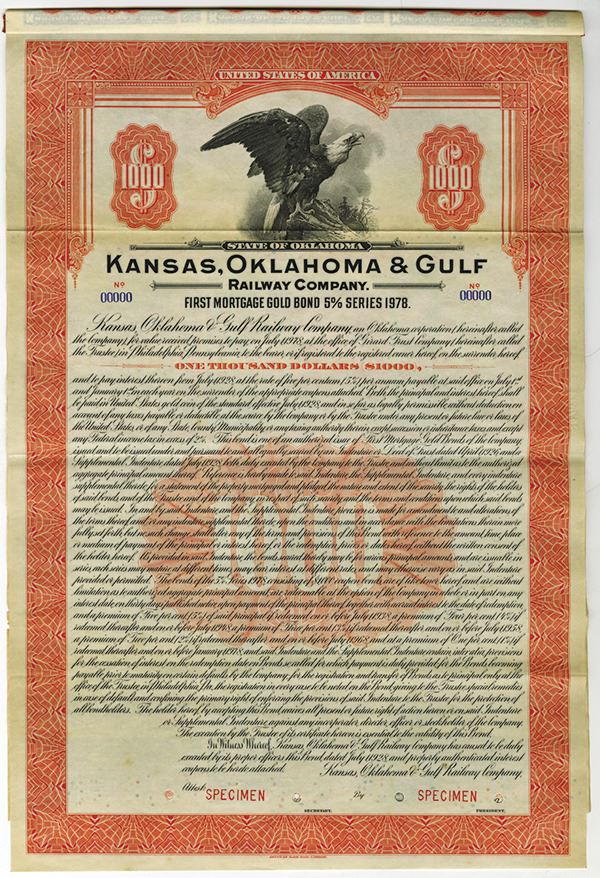 Oklahoma. $1,000 Specimen 5% First Mortgage Gold Coupon Bond, Black print on orange border and under tint, Bald Eagle at top above title, Specimen overprints and POC's, Fine-VF condition, ABNC. Listed railroad on Cox, unlisted Bond type.