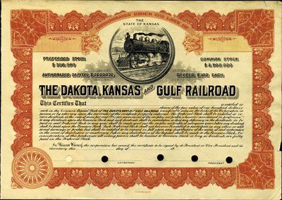 19--, ca.1900-20's. Odd Shs. Specimen stock certificate. POC's. Orange border. Vignette of speeding locomotive. Fine condition with toning and small tears in right margin. Rare. SBNC.