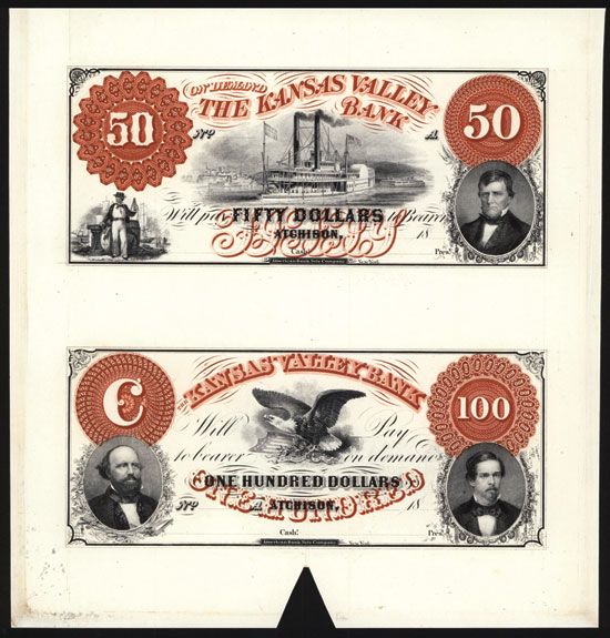 Atchinson, Kansas. Lot of 2 notes (uncut partial sheet of 2), 18xx (ca.1960-70's), $50-$100, (KS-10-G-14a; G-16a). Modern ÒProprietary ProofsÓ. The $50 note has sailor at dock on lower left, steamboat in middle and man on lower right; the $100 note has men flanking eagle in middle. Black printing on red underprint on thin white card, CU to Gem Uncirculated condition. ABNC. Archival ÒProprietaryÓ proofs rarely seen in sheet form. (ABN Commemoratives, AIA XI, May 15, 2012)