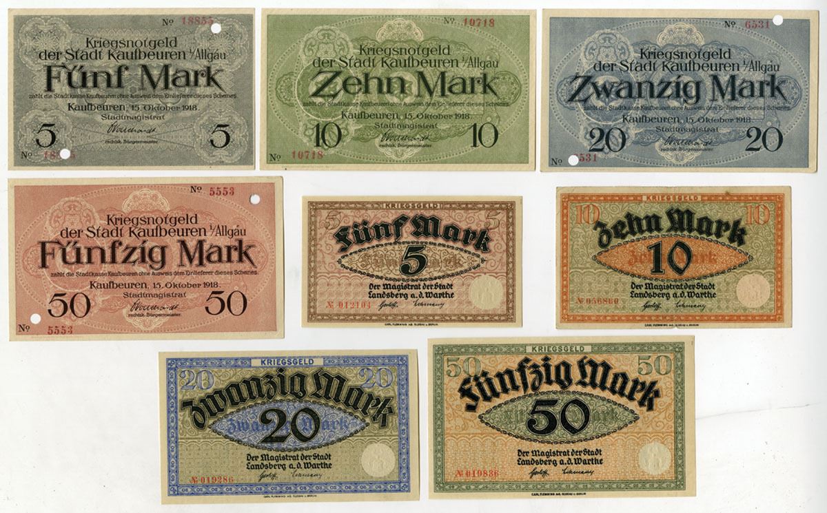 Germany and Poland, 1918. Lot of 8 Issued and Cancelled Notgeld, Includes: Stadt Kaufbeuren 5 Mar, 10 Mark, 20 Mark, & 50 Mark - with the 5, 20, and 50 Mark Notes have POCs; Stadt Landsberg an der Warthe 5 Mark, 10 Mark, 20 Mark, & 50 Mark - with the 10 & 20 Mark notes having "Ungulitig" stamped on backs. Notgeld range from VF to AU condition. (8). Sold "AS IS" no returns accepted.