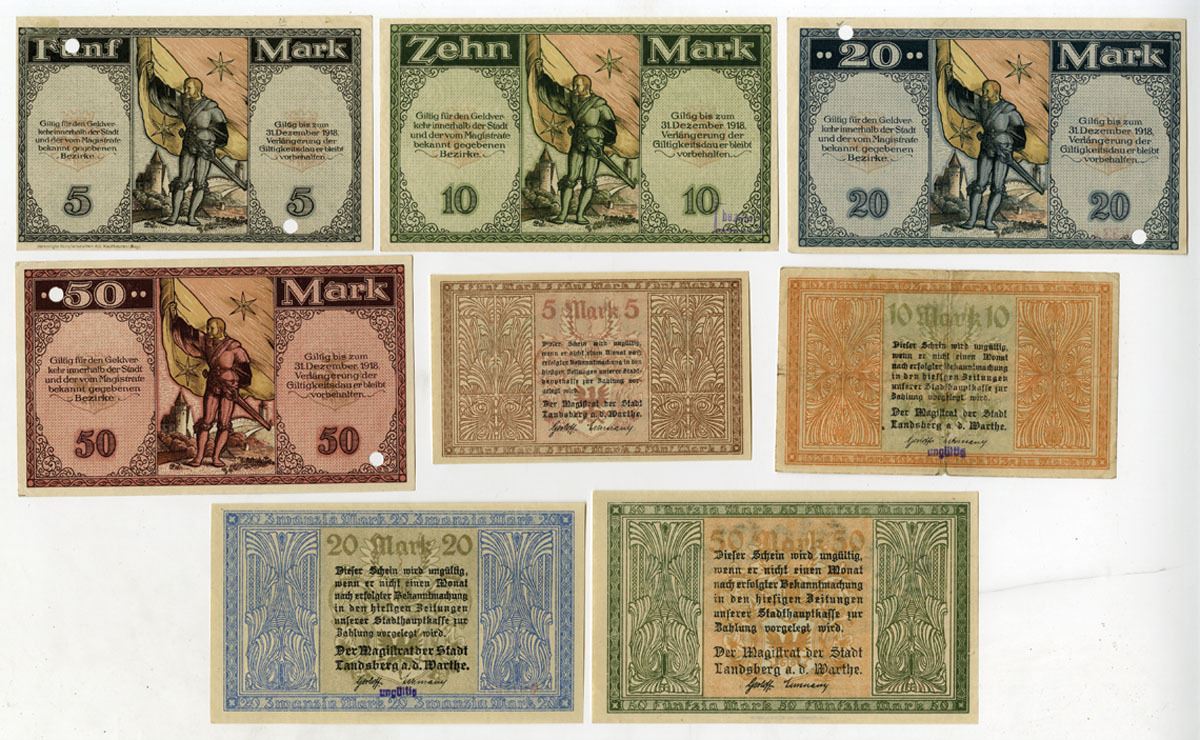Germany and Poland, 1918. Lot of 8 Issued and Cancelled Notgeld, Includes: Stadt Kaufbeuren 5 Mar, 10 Mark, 20 Mark, & 50 Mark - with the 5, 20, and 50 Mark Notes have POCs; Stadt Landsberg an der Warthe 5 Mark, 10 Mark, 20 Mark, & 50 Mark - with the 10 & 20 Mark notes having "Ungulitig" stamped on backs. Notgeld range from VF to AU condition. (8). Sold "AS IS" no returns accepted.