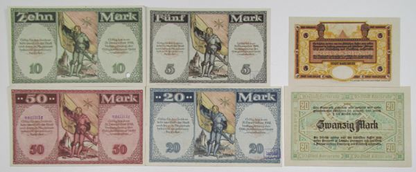 Germany. 1918, Lot includes from Kaufbeuren i. AllgŠu a quartet of 5, 10, 20, and 50 Mark war Notgeld, the 10 with POC; and from Karlsruhe a pair of 5 and 20 Mark Notgeld. XF to AU. (6)