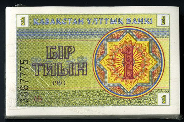 Kazakhstan, 1 Tyin, 1993, P-1, pack of 100 UNC issued notes.