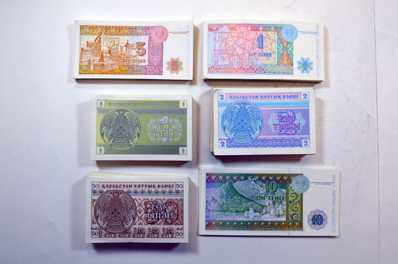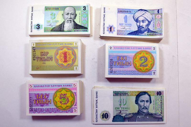 Kazakstan. 1, 2, 5 Tyin 1, 3, 5 Tenge. P-1, 2, 3 (Low and high serial # positions on each); 7a, 8a, 9a. Generally Very Fine to Extremely Fine. About 100 each of first four, 25 or so of last two. Also includes 10 tenge P-10a (13, Extremely Fine or better) 20 Tenge P-11a (4, Fine to Very Fine). Over 450 pieces.