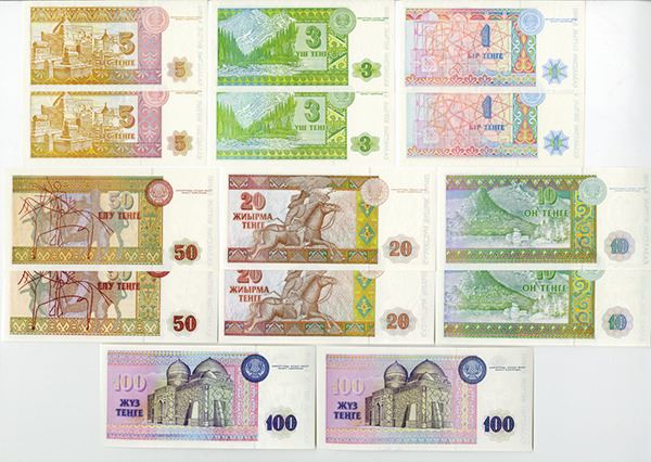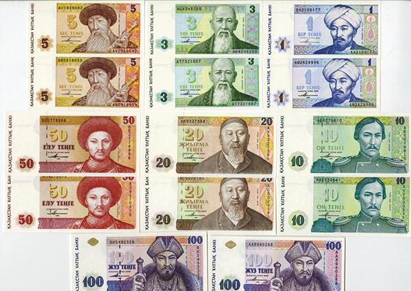 Kazakhstan. Two identical sets of 7 issued notes, each including 1, 3, 5, 10, 20, 50, and 100 Tenge (14 notes). P-7a, 8a, 9a, 10a, 11a, 12a, 13a. First year of issue. All Choice to Gem Uncirculated. (14). (Arthur C. Matz Collection)