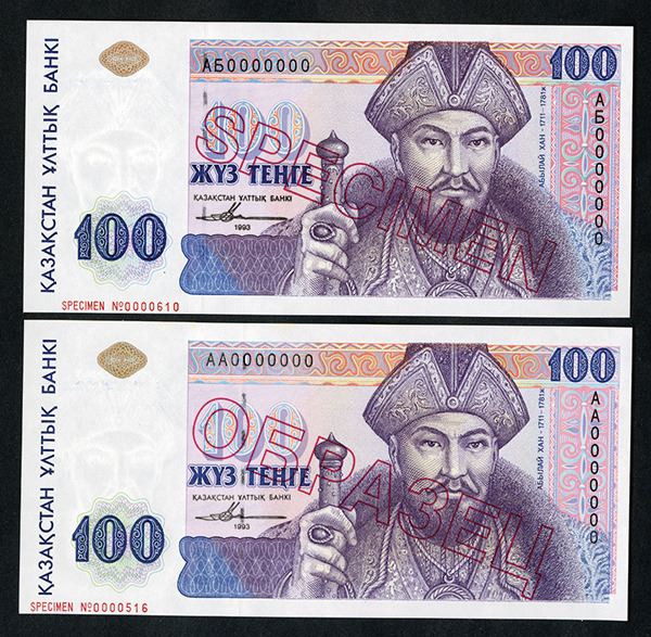 Kazakhstan, pair of specimen 100 Tenge, 1993, P-13s, S/N AA0000000 and AB0000000. Choice to Gem uncirculated condition and scarce in this form.