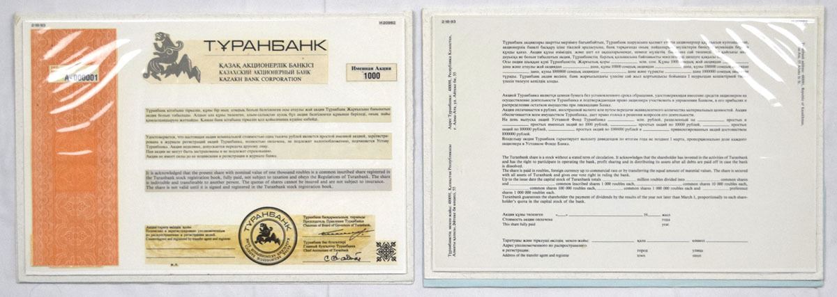 Kazakhstan. 1993, Obverse and reverse pair of composite essays / models of stock certificate for TuranBank Open Joint-Stock Company. TuranBank OJSC which is a Kazakh Bank Corporation that provides various banking products and services to corporate and retail customers in the Kazakhstan, Azerbaijan, and other places. Each of the two pieces is mounted on a bifold card folio. S/N A000001, About to Choice UNC. Unique.