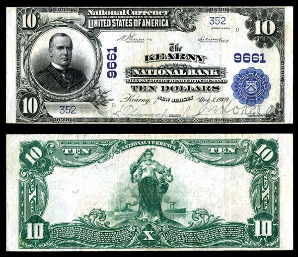 Kearny National Bank, Kearny, NJ, S/N 352, Vernon | McClung signatures, PMG graded Very Fine 30 EPQ with claims to XF condition, Margins do not touch the note, 9 Large with 2 $10 PB's known, including this example, also one Small note known from this scarce national bank. Signatures hand stamped, rare note that is sure to attract attention.