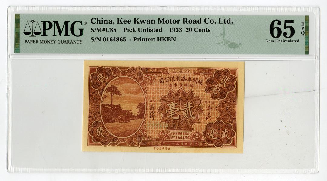 China, 1933. 20 Cents, P-Unlisted S/M#C85, Issued Banknote, Dark brown on light brown underprint with automobile at left, Back is orange, S/N 0164865, PMG graded Gem Uncirculated 65 EPQ, Printer: HKBN.