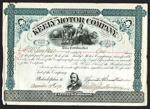PA. 1 Share, I/U, Black on green border, Keely at bottom, allegorical woman at top with ornate motor, VG to fine with edge faults and small tears otherwise very attractive. National BNC. Famous fraud.