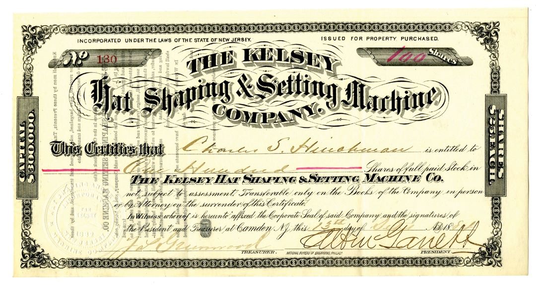 New Jersey, 1884. 100 Shares I/U Stock Certificate #130, Black text with black border. Fine-VF condition.