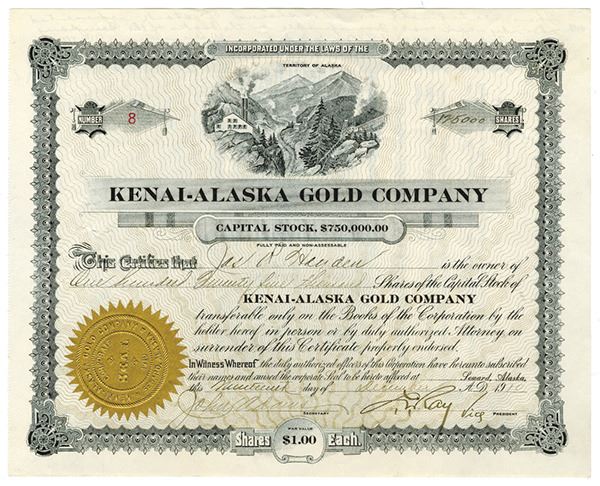 Seward, Alaska. 125,000 Shares, I/U Stock Certificate, black on gold underprint, mining scene at top, S/N 8. The share amount equals 1/6th the total capitalization of the company. First time seen by us.
