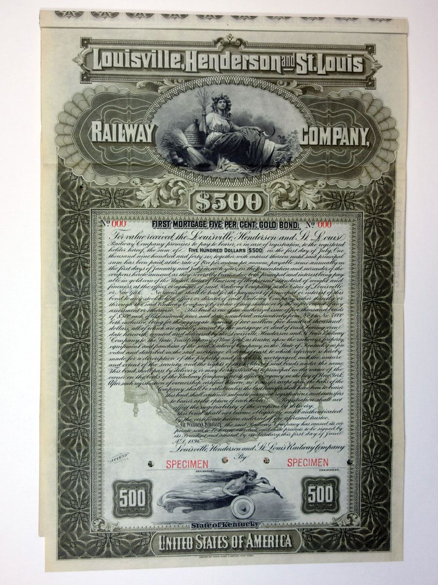 Kentucky. $500 Specimen, 5% 1st Mortgage Gold Coupon Bond, Black printing on ornate olive green border and under tint, Allegorical reaper reclining at top with wheat and scythe, Specimen overprints and POC's, VF-XF condition, ABNC. Unique in Archives as a specimen and unlisted in Cox as a bond.