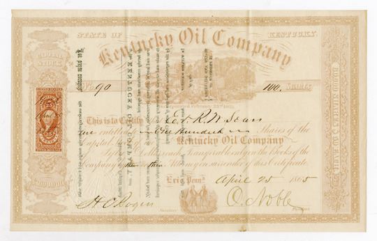 Erie, Pennsylvania. 100 Shares, I/U, brownish pink, oil scene top middle, printed on thin paper, back printing showing through paper, S/N 90. VF condition. Also includes letter from an old friend, Coleman Leifer, to another collector discussing the certificate and adventures in collecting land.