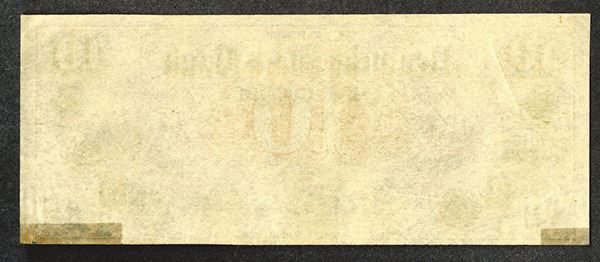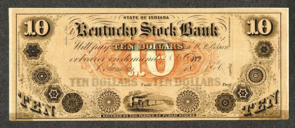 Columbus, Kentucky. $10, Remainder banknote, Black on red-brown underprint, Small train at bottom with small circular cycloid engravings bordering margins. Appear Choice AU-Unc. With tape remnants on the bottom left and right corners. Attractive fully tinted note. DWC, Phila. & Cin.