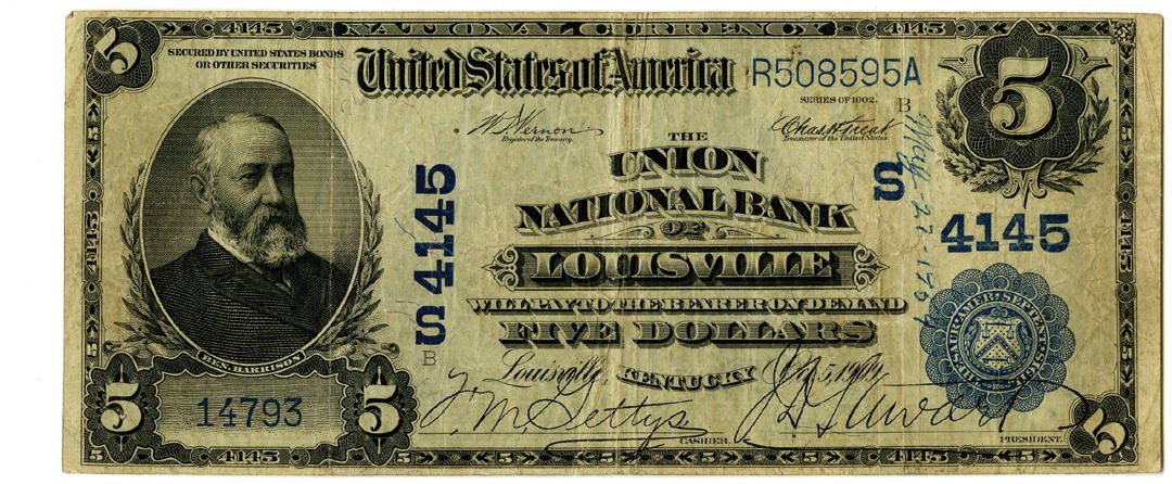 Louisville, KY. $5, Series of 1902 DB, CH#S 4145, S/N 14793-R508595A, VF condition with graffiti on the back.