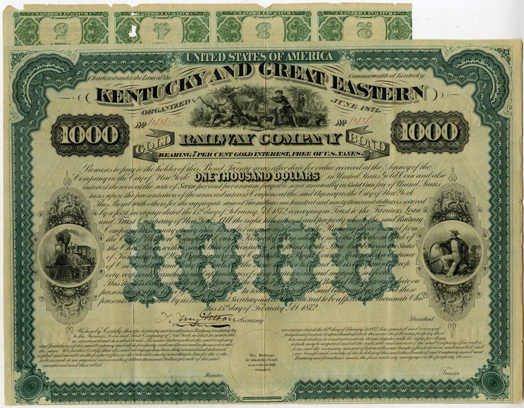 Kentucky, 1872. $1000 Partially Issued 7% Gold Coupon Bond, Black text with green border and underprint, Boone rescued by Kenton vignette at top center. Fine condition with archivally repaired splits throughout. ABNC.