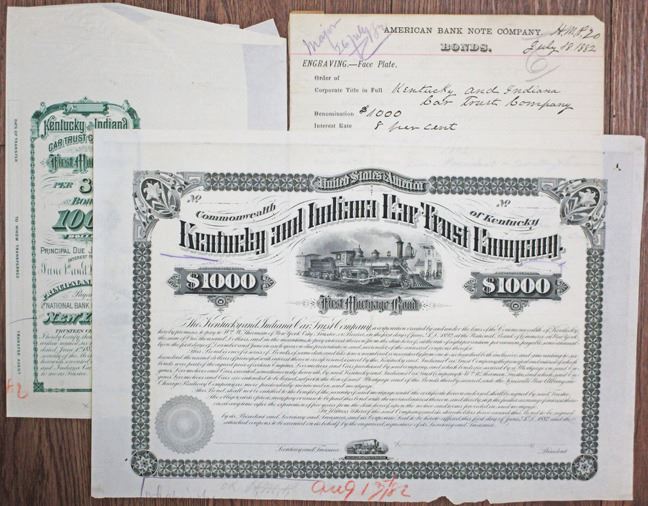 Kentucky, 1882. Lot of 3 pieces, Includes: $1000 Proof 8% First Mortgage Bond, black and white, with notes made throughout; Corresponding proof back of bond in green, with approval initials and note; and ABNC Bond Engraving Plate Form, partially handwritten. Unique and rare lot, ABNC.