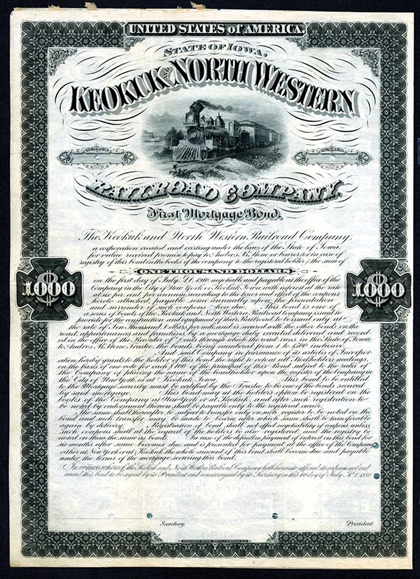 Keokuk and North Western Railroad Co., 1880 Specimen Bond. Iowa. 1880, $1000 Specimen 1st Mortgage 6% Coupon Bond, Black without underprint, Locomotive R-L with steamboat in background, POC's, Mounting remnants on top margin, otherwise in Fine condition. Unknown as an issued bond and extremely rare as a bond. Franklin BNC.