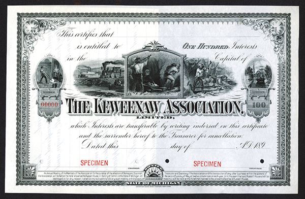 Detroit, Michigan. Miners flanked by train, ships, woodcutter, Specimen for 100 Interests, ABNC, EF. This company held canal grants that included rights to cut timber.