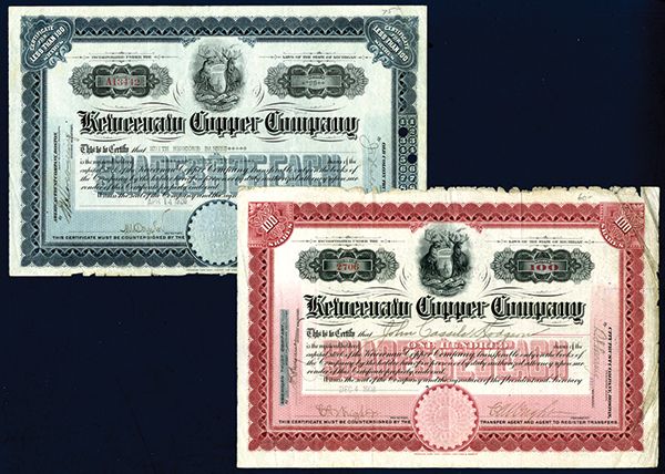 Keweenaw Copper Co., 1908-1920 Stock Certificate Pair. Michigan, Lot of 2 stocks, Includes 1908, 100 Shrs, with numerous installment hand stamps on back, VG-Fine with edge problems and 19120, 25 Shrs, Fine with small edge problems on the bottom. ABNC.